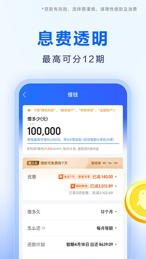 1、极速借钱:接入借去花与贷款超市双通道,最高可申请20万元信用额度,日利率低至0.02,系统智能审核,10秒完成初审,最快60秒到账。