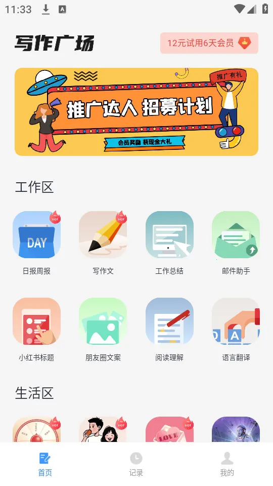 3、多场景满足需求:涵盖工作区的日报周报等,生活区的写情书等多种场景,各行各业都能简单描述后让系统生成相应内容。