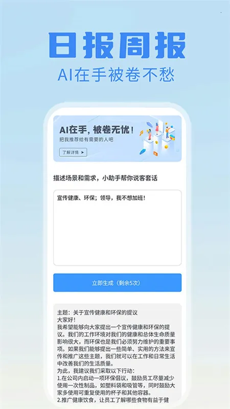 日报周报生成器app利用先进智能技术,可一键生成日报周报等,有强大AI写作能力。含多种生成器,输入关键内容就能生成相关报告。界面人性化,操作简单,还支持多语言,注重安全隐私,能提高工作生活效率。
