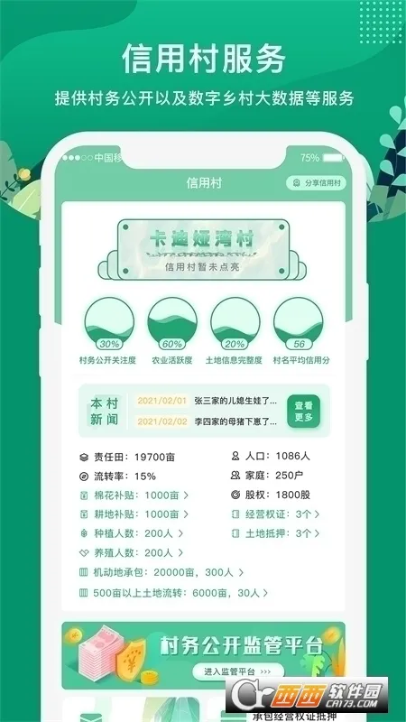 1、e聚农宝2025基于农业产业链和产业圈大数据,为土地确权人和流转人构建信用服务,以信用分作参考,让用户享受更多征信权益。