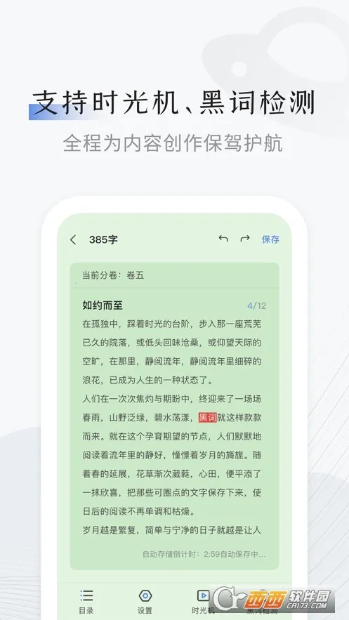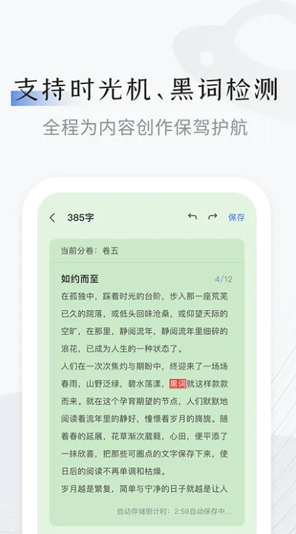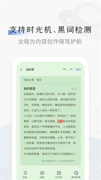 3、提供时光机黑词监测等功能,为创作内容保驾护航,让用户无需担忧内容安全问题,安心创作。