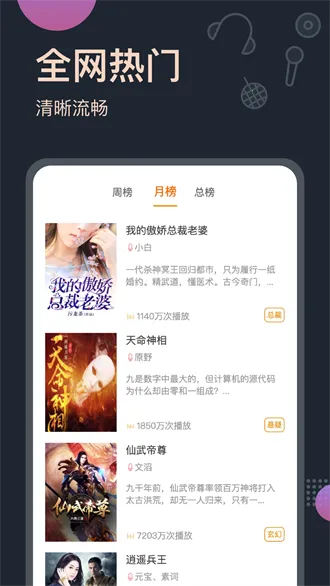 1、海量资源:涵盖文学名著、玄幻修仙、都市言情等多种类型,还有热门作品及高分排行、全网热搜的霸榜之作,满足多样听书需求。