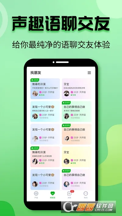 声趣语音是一款语音交友平台,提供多元便捷服务。支持多种交友方式,有智能匹配。具备多人语音室等丰富互动,用户实名注册安全可靠。界面简洁、功能全、音质高且稳定,能助用户突破社交限制,玩法众多 。