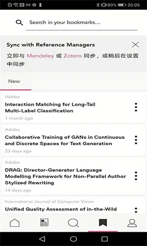4、个性化体验:可设置关键字或作者订阅源,支持与文献管理软件同步,还能开启通知获取偏好内容最新信息 。