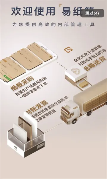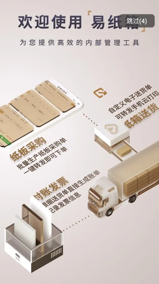 易纸箱最新手机版是专为纸箱厂定制的数字化管理系统。覆盖多省市,集纸板团购、纸箱送货、客户对账等功能于一体。能快速开单、线上采购、轻松对账,支持移动办公,优化成本,助用户实时掌握工厂经营。