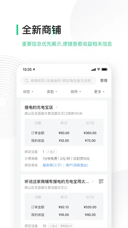 2、操作简单,能轻松管理充电宝设备,可一键查看自己投放店铺的收益情况。