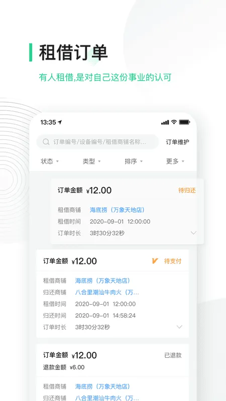 4、有收益板块、租借订单等功能,还有全新视觉界面,干净清爽 。