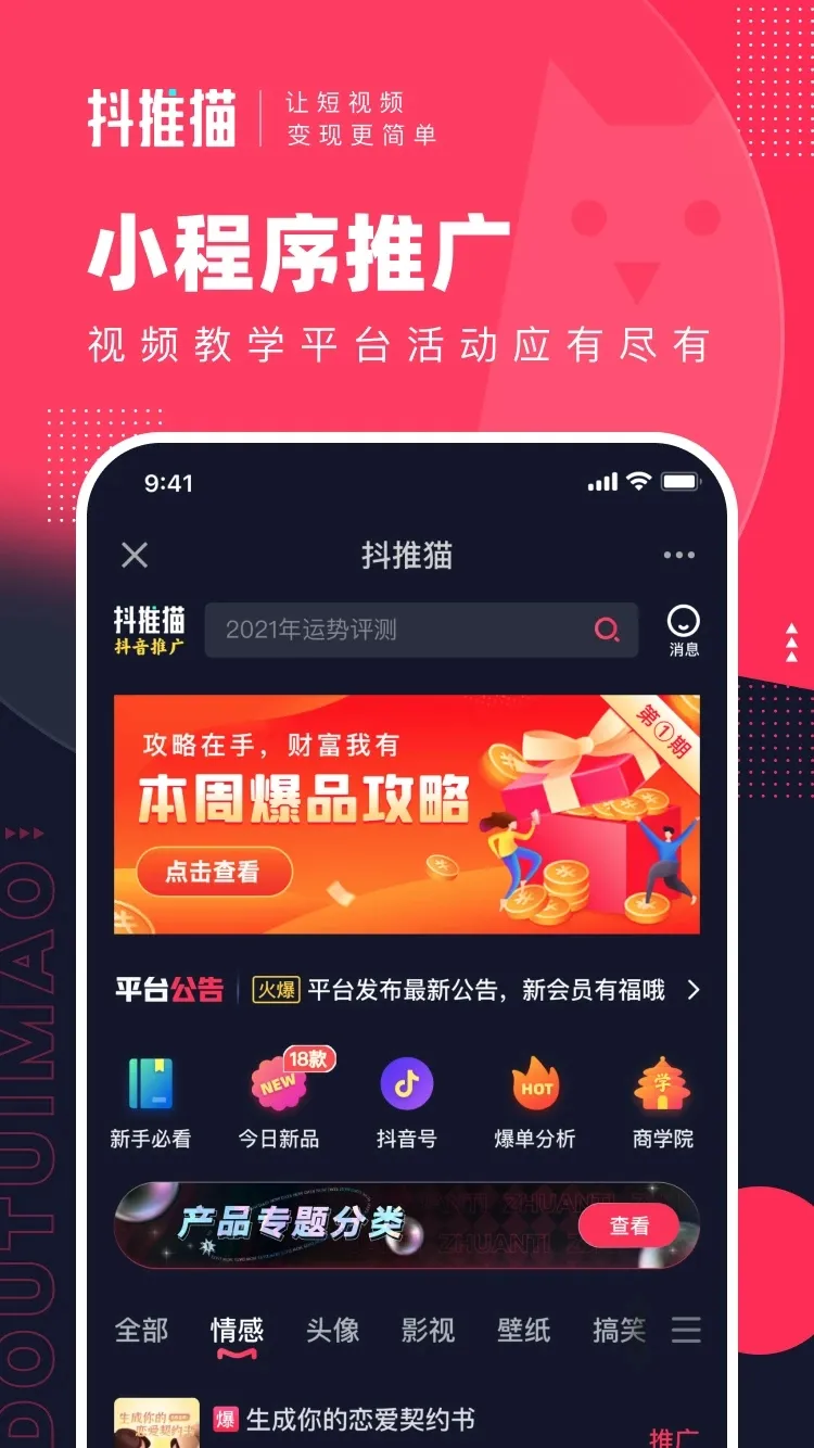 抖推猫2025是一款集海量影视小说与电商资源于一体的APP。用户能在线浏览、搜索、看剧、阅读,还有兴趣推荐。它提供多种赚钱途径,如推广、发视频等,且功能丰富,更新及时,助创作者轻松变现 。