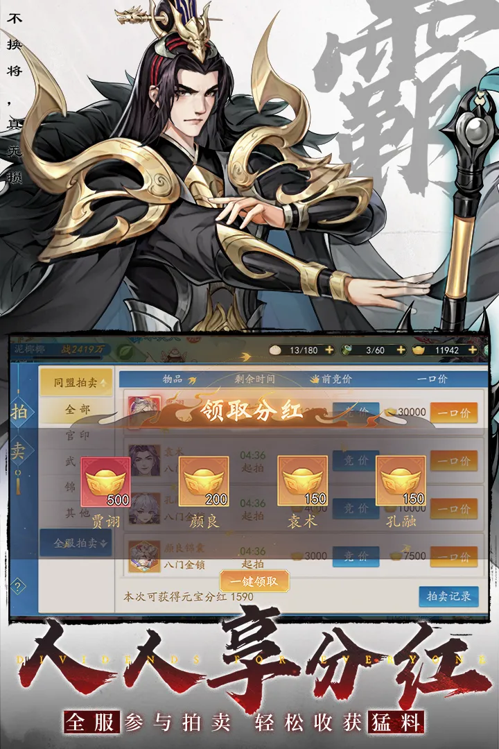 2、特色系统:游戏有上阵超持久、零损大换新、指尖定乾坤、全员分好礼等特色。如名将自由搭配,换将零损继承,首创专武继承;四大阵营有独特机制;全服参与拍卖分红等。
