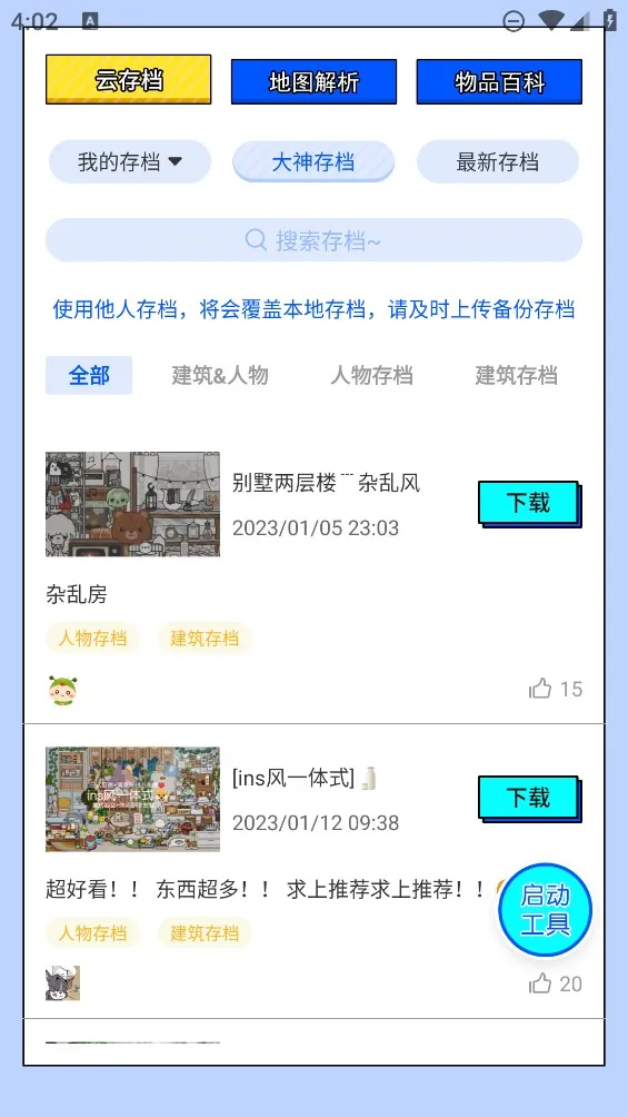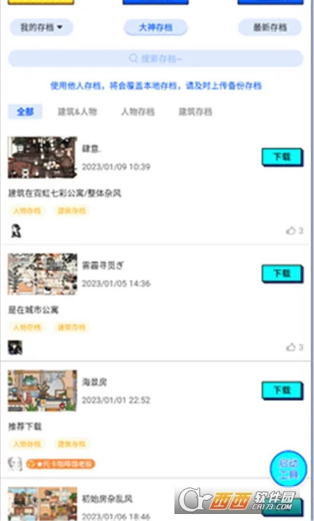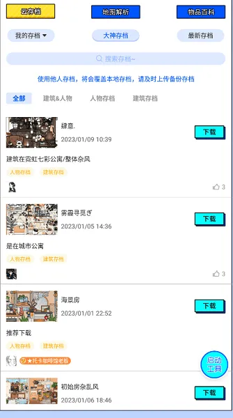 2、云存档可让玩家下载大神存档学习,也能上传自己创作的存档获取点赞与下载。