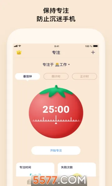 2、专注功能支持:软件提供多种专注模式,如普通严格模式、番茄钟倒计时时间累加模式等,支持白噪音翻页钟,结束时可选择提示音或震动提醒,专注过程能设白名单,完成专注有卡片奖励并记录时间。