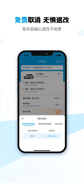 3、用车无忧,支持免押租车、自助取还、免费取消订单,还有全天客服。