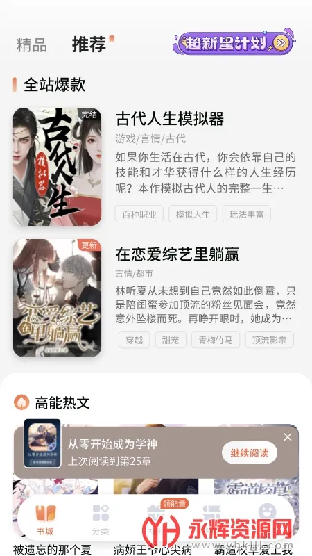 3、优质体验:界面简洁易用,分类清晰明确,首页自动推荐热门好书。内置超大云端书架,连载小说更新快。