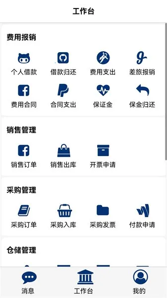 1、 基础设置与业务模块:包含基础设置、财务总账、采购管理、销售管理、仓储管理、生产管理、资金管理、项目管理、费用报销等业务模块。