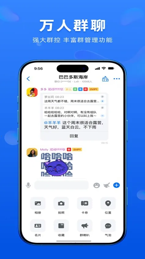 2、支持文字、语音、视频通话及文件传输,适用于个人和团体群聊,支持500人超大群组,有设置管理员禁言、文件共享等功能。