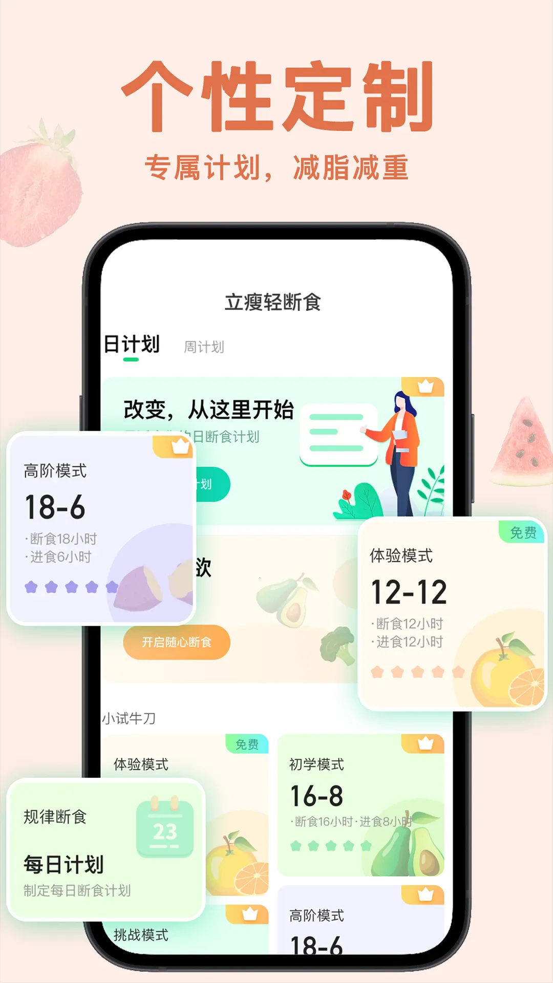 1、个性化定制:根据用户自身身体数据和体重目标,制定专属轻断食计划。