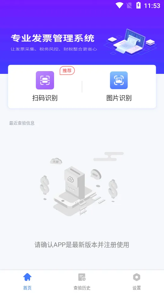 2、查验方式丰富:有图片识别,上传发票图片即可查验;扫码识别,扫描发票二维码快速获取结果;查验历史,实时跟踪结果并查看全票面信息。