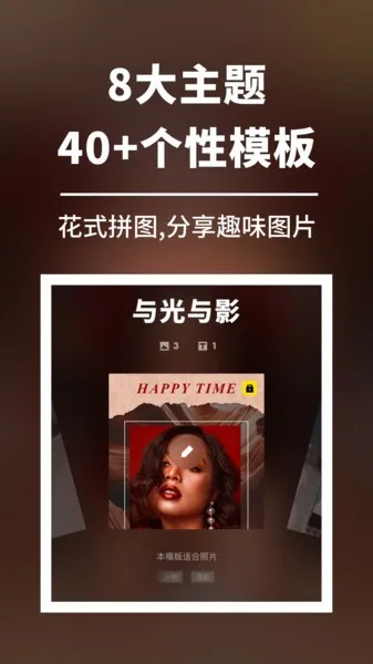 1、海量模板滤镜:拥有8大个性主题、40种创意模板,还有15种精选滤镜,能随时随地拼出时尚大片创意拼图。