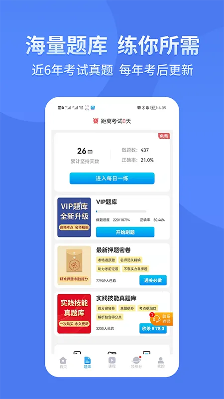 4、持续更新优化:软件不断更新,如题库模块升级、课程视频播放体验优化、历年真题优化升级等,以适配各机型,提升用户体验。
