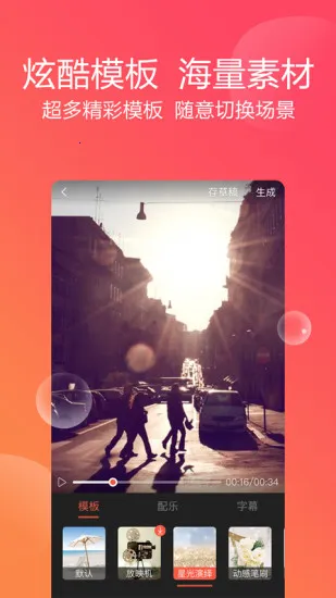 2、素材丰富:拥有精美素材免费使用,炫酷模板每周更新,还有几千款电影片段场景制作,毕业纪念、聚会旅行等各类模板应有尽有。