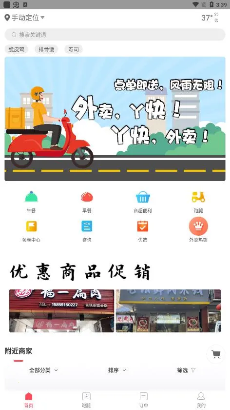 3、服务多样:除餐饮外卖专业配送外,还提供生活跑腿、团购娱乐、便民信息、同城服务等。