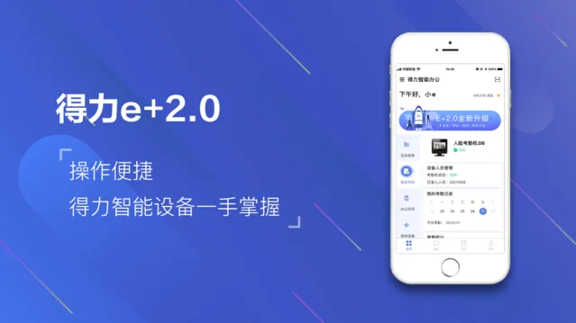 得力e+(智能办公平台)由得力集团打造,历时一年研发,现已升级到2.0版本。它集通讯、协同办公、硬件管理于一体,有企业通讯录、IM通讯、智能考勤等功能,支持多设备连接,停电也能打卡,降低企业成本,提升办公效率。