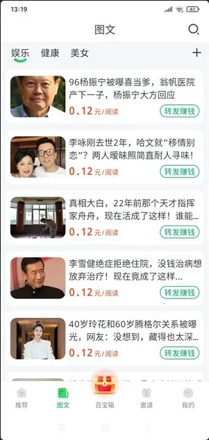 2、任务丰富多样,每日有10亿红包雨,任务中心有签到、晒收入、玩游戏、发评论等几十种赚钱任务,闲散时间就能轻松赚零花。阅读赚提现秒到账,有独家原创内容。