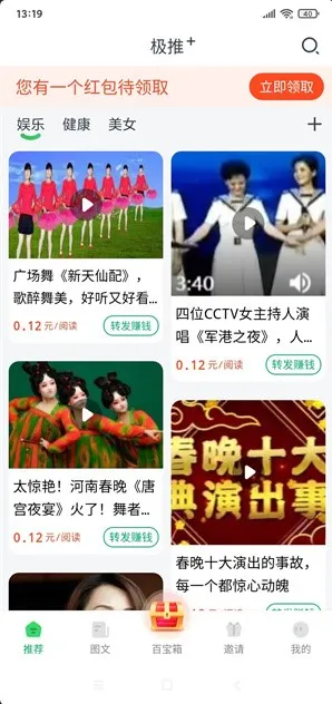 4、极推亮点众多,依托用户智能推荐,能提前了解社会热点。视频赚可边看边领钱,海量视频完爆主流平台。邀请好友赚现金,每日躺赚至少100元起。