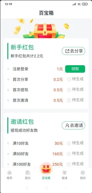 3、极推赚钱方式多样,除了阅读赚、视频赚,邀请好友还能每日躺赚现金,至少100元起,既能和亲朋好友互动,又能增添生活乐趣与收入。