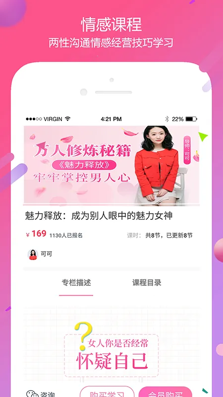 3、课程专业多样:有丰富专业的情感课程、优雅趣味的两性课程等,为人生指点迷津,增添爱情趣味。