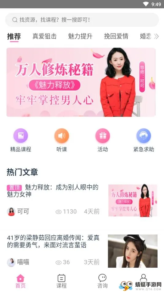 2、资源丰富多样,涵盖多品类情感干货、丰富专业的情感课程,还有高质量情感资源助力女性终生自我提升,能解决找对象、恋爱、婚姻等各类情感难题。