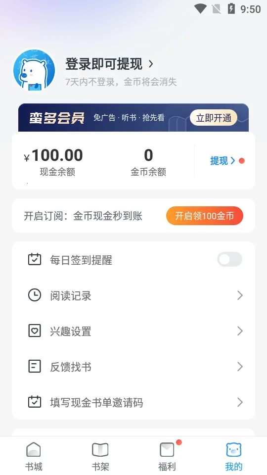 4、软件福利多,采用阅读奖励模式,完成阅读任务可赚金币,收益达10元就能提现,新用户注册还有红包,邀请好友也有福利。