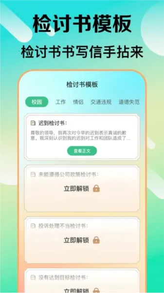 场景全覆盖:深入分析成百上千个检讨真实场景,从职场校园到家庭社交,能精准匹配各类场景,避免生搬硬套的尴尬。