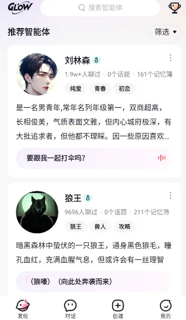 1、智能体使用与制作:Glow安卓版汇集大量优质智能体,使用简单,用户无需自行设置。若没找到所需智能体,也能自行制作,完善补充角色设定后,软件会自动生成。
