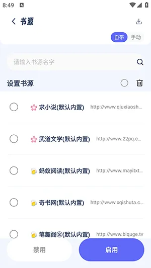 4、便捷操作:支持在线阅读节省空间,能将喜欢小说加入收藏;书源导入方便,自带书源勾选启用或手动输入搜索启用即可。