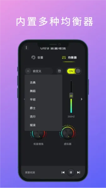 1. 全频均衡器与自定义预设:提供20种专业预设如摇滚、古典、流行等,还有无限自定义选项,用户可自由调节各频段表现,