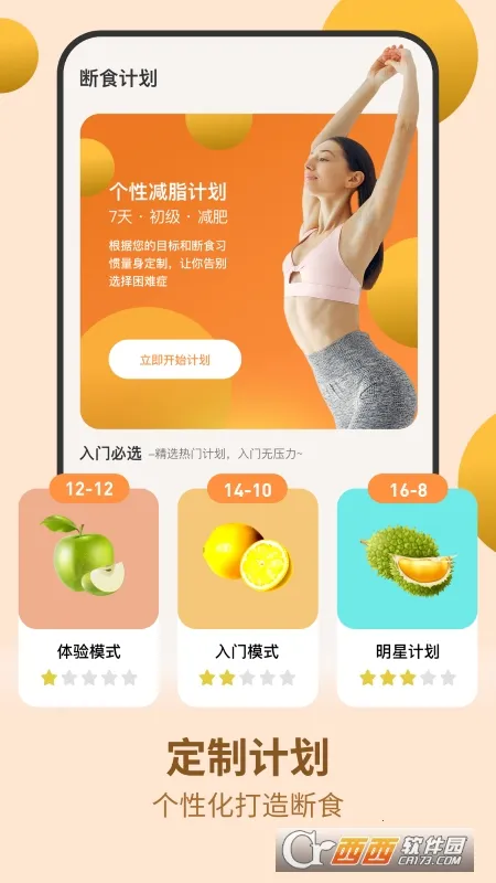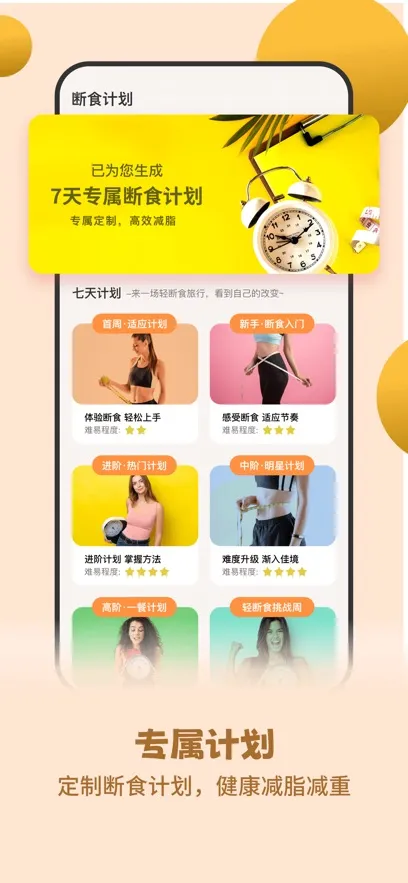2、它能量身打造断食计划,强度层次分明,有多种模式供用户根据自身适应度选择,还会记录体重,助您更高效减肥瘦身、拥有健康身体。