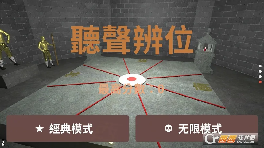 3. 初始生命值为三点,玩家需在屏幕变黑后聆听铜钱落地声音,从八个方向中选择声音来源,选对得分,选错扣生命值,全部耗尽挑战结束。