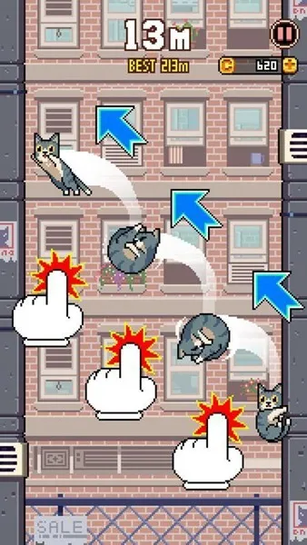 1、操控猫咪穿梭楼顶,轻触屏幕控制跳跃节奏,闪避陷阱机关并收集金币。