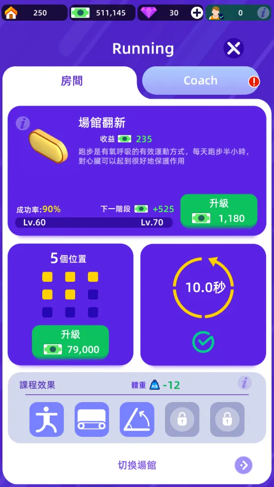 4. 无需联网,离线状态也能游玩,让玩家随时经营健身房。