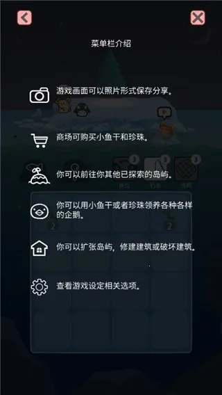 3、丰富内容:有多种实用道具,可收养50种造型独特的企鹅,每座岛屿设有7种不同建筑可供建造。