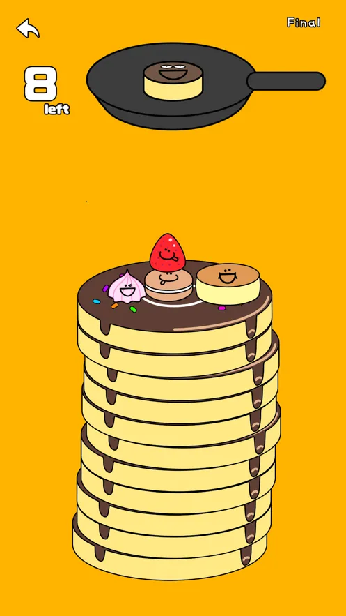1. 玩法简单易上手,玩家通过点击屏幕让煎饼下落,将其从锅中取出放在盘子上摞起来,搭起更高的煎饼塔。