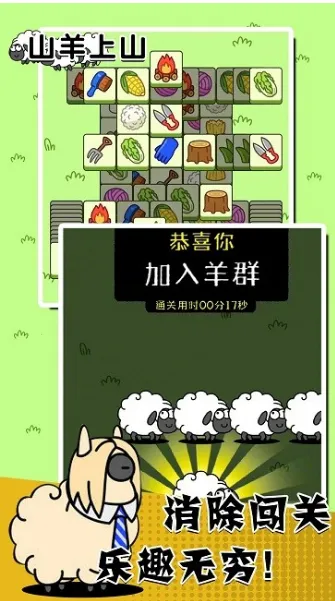 山羊上山是一款卡通背景消除闯关游戏,画面清新。玩家通过简单手指操作,点击相同物品移到一起消除,利用道具和提示闯不同关卡,有超难挑战关卡,完成任务可获奖励,玩法经典,还有逼真音效。