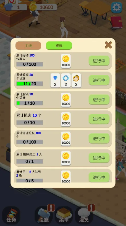 3、消除玩法助力升级,可通过合并消除解锁新菜谱、升级雇员。