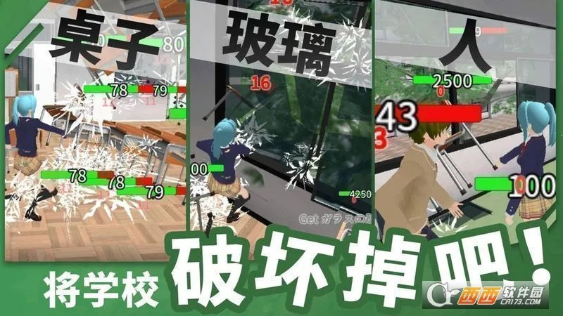 1、校园破坏:游戏以校园为背景,玩家可对校园内的桌椅板凳、墙壁天花板等物品进行破坏,释放压力。
