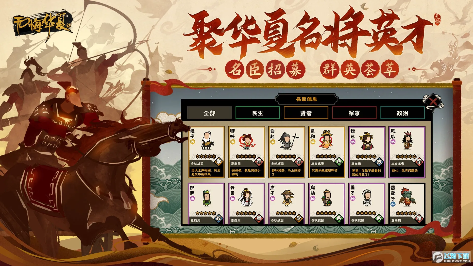 4、名臣系统:能获取范蠡、张仪、孟子、孙武等不同历史角色名臣,他们各有主张和技能,相互搭配可产生不同效果,助力玩家发展势力。