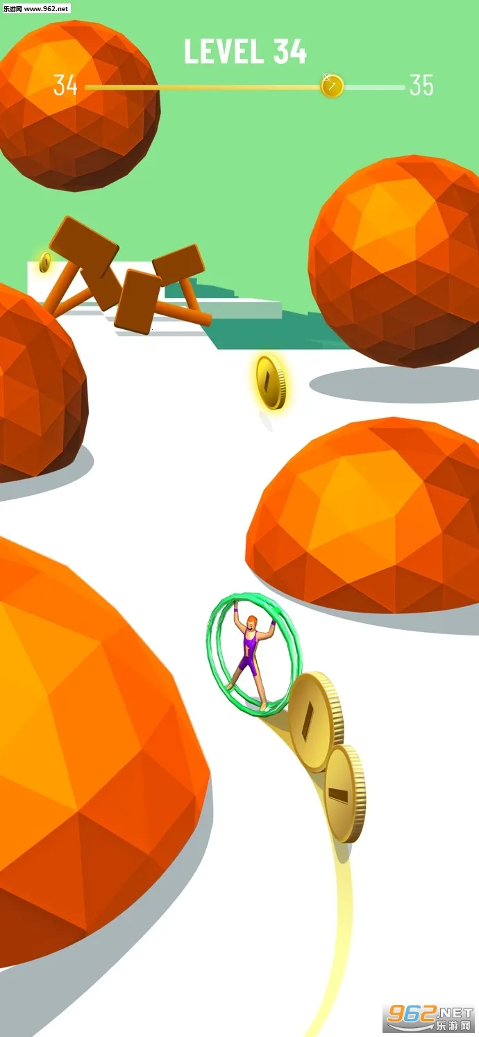 1、操控金币跑酷:玩家操控金币在立体赛道滚动前进,通过左右滑动保持平衡,躲避障碍并收集道具。