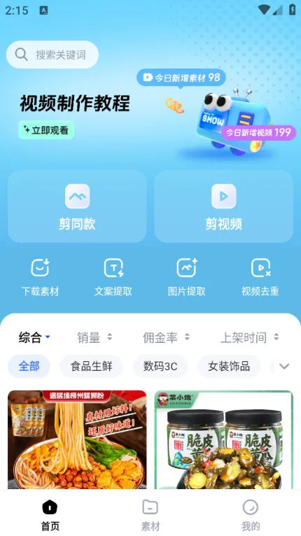 天天速剪 2025 官方正版专为商品视频剪辑打造,功能丰富。有同款搜索、文案提取等实用工具,视频去重保障原创。界面友好操作简单,提供详细教程,新手老手皆适用,助用户高效制作商品宣传视频 。