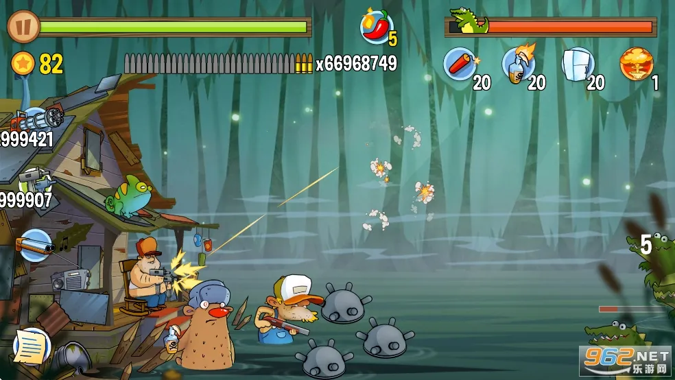 沼泽激战拥有独特玩法,玩家抵御沼泽生物攻击,操作简单易上手,点击屏幕射击,拖放炸药范围攻击,切换武器应对不同怪物,升级装备提升战斗力,带来丰富游戏体验。