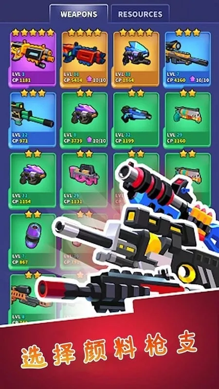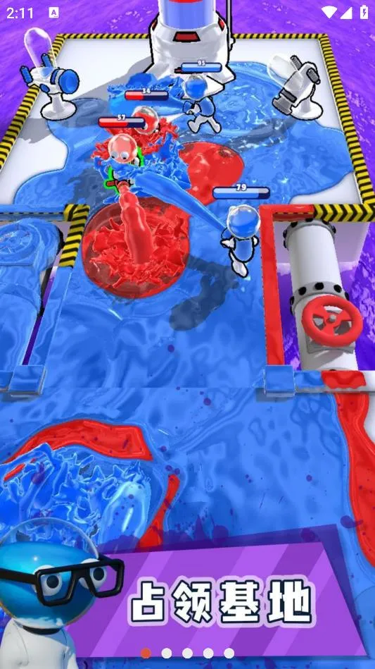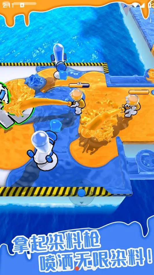 2、游戏中玩家要与队友组队进行塔防争夺,使用喷射枪对哨塔染色,按占领面积决定胜负,共有红蓝黄三支队伍展开竞争。